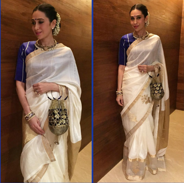 Karisma Kapoor was recently spotted at an event where she looked ethereal in an indian look. She opted for beautiful saree by Raw mango which she accessorized with choker and bangles from Amrapali jewelery and she complemented her look with bag by Riddhi Tolia and she was styled by Eshaa Amiin.