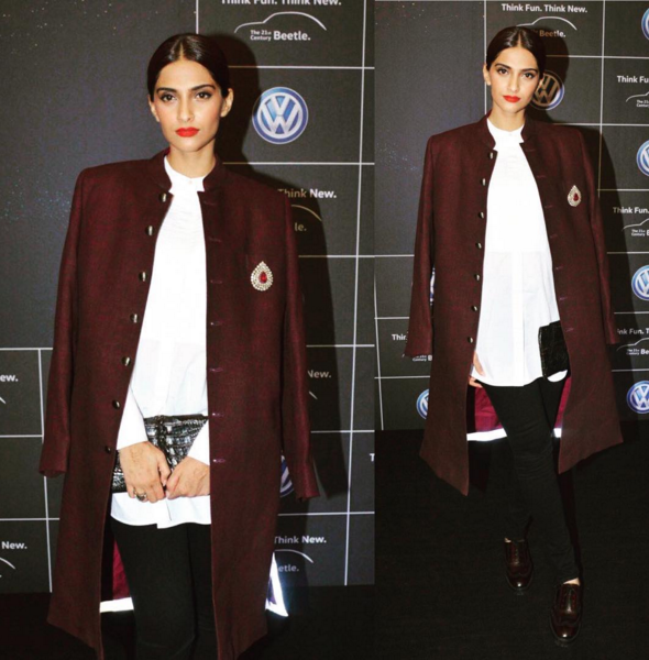 Sonam Kapoor was recently spotted at the Kunal Rawal's fashion show. She looked stunning in the white shirt by Vince which she paired with long red jacket from Kunal Rawal and the look is absolutely stunning! We love her pants which are from Rag & Bone. She finished her look with shoes from Zara and clutch from B Romanek. The sharp look was styled by Rhea Kapoor and her make up was done by Nitin and her hair was done by Suhas. Yeah, you nailed it!