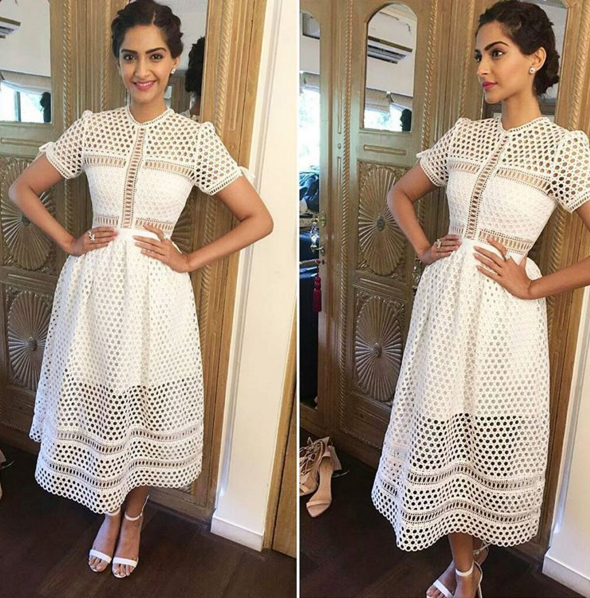 After Mira Rajput, Sonam Kapoor tried her hand on the famous naked dress. She recently attended the event of Filmfare magazine and she opted for a self portrait dress in white colour. She finished her look with an updo and white sandals. Her make up was done by Namrata Soni and the look was styled by Rhea Kapoor.