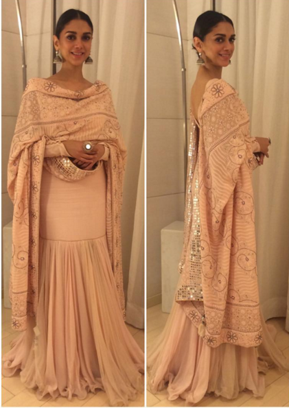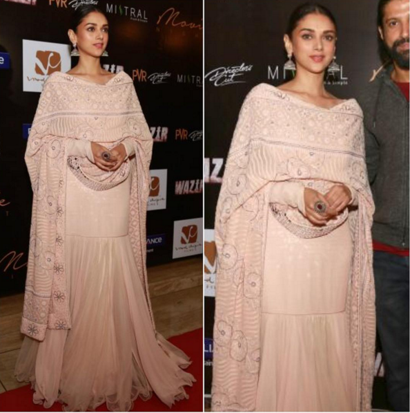 Aditi Rao Hydari is very busy in promotions of Wazir. She was recently spotted for an event where she opted for an Indian ensemble from Akriti and Sukriti which she accessorized with Amrapali Jewelery. The look was styled by Sanam Ratansi. She looked so ravishing in this canny mix of peach and silver.