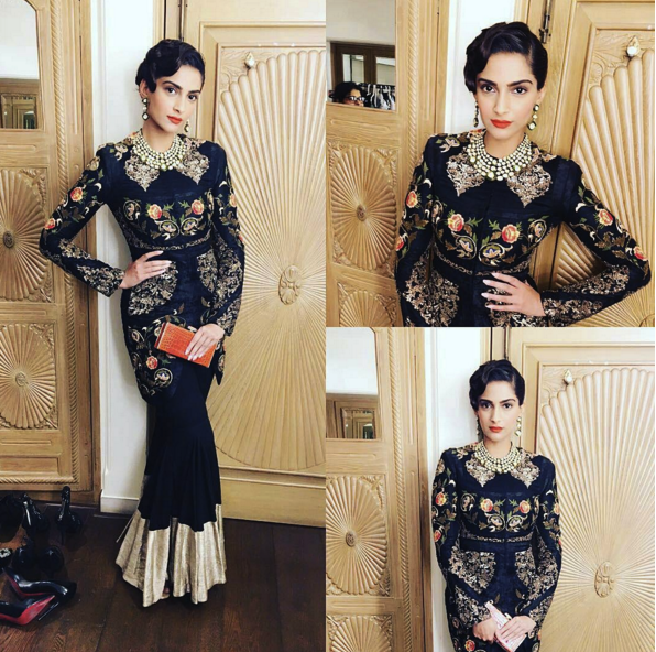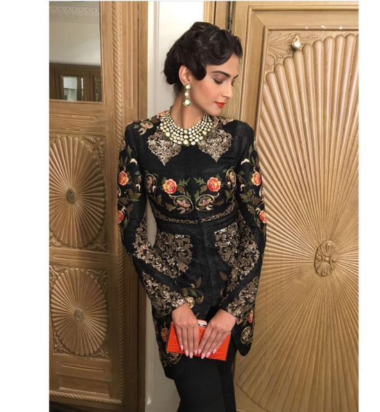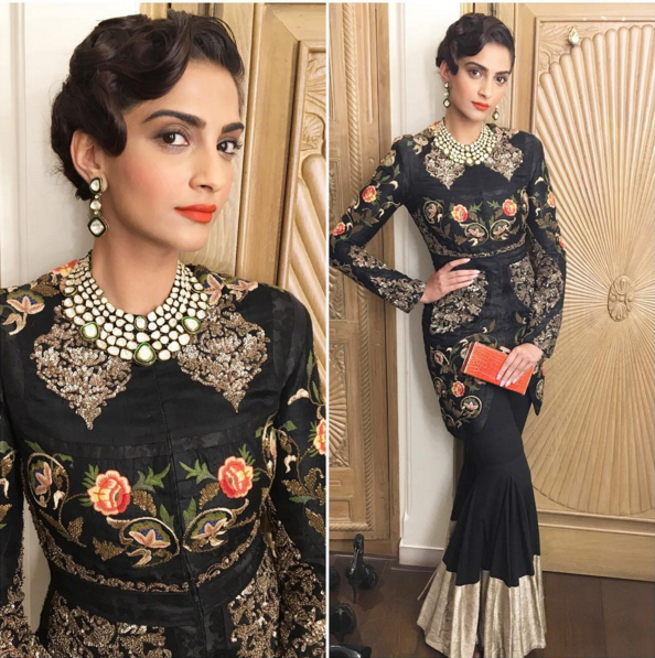 Sonam Kapoor looked breathtakingly beautiful in this Anamika Khanna attire which she complemented with 20s hairdo. She finished her look with orange lips and the make up was done by Namrata Soni.