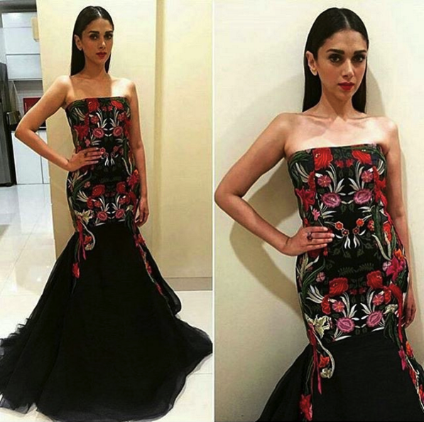 Aditi Rao Hydari at the awards in a beautiful embroidered gown by Gaurav Gupta