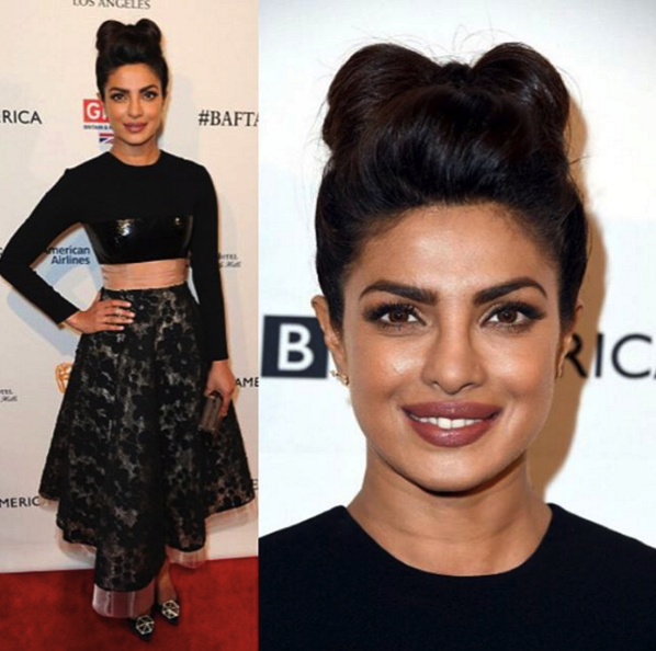 She took her hairstyle to next level with this bow bun and we think she looks super pretty in it. She wore an Alex Perry Official outfit with A Jimmy Choo Clutch & Nicholas Kirkwood Shoes at the #BAFTATea in Los Angeles, California.