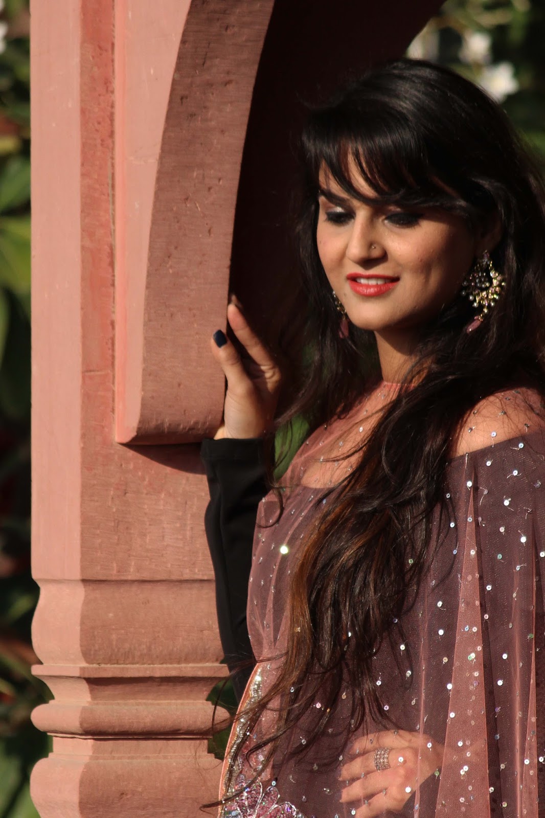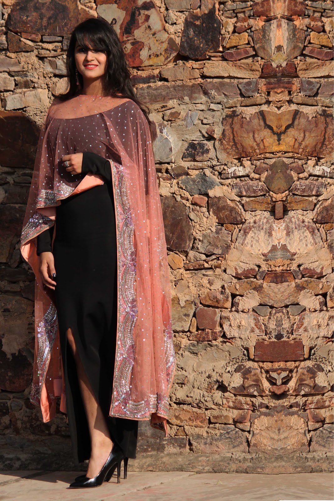 I have not been a caped crusader, but I always wanted to get myself a beautiful outerwear that too in my Indo-western wardrobe. I waited for a while to finally select a cape style and I knew that I wanted long extended net cape with a dress. Cape is a stylish addition that will surprise you as to how versatile it can really be. Also, the cape I am wearing has been made out of a dupatta that belonged to my sister's engagement dress.