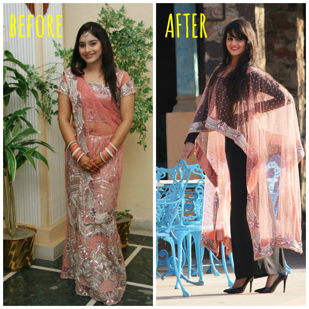 Capes are pretty unique, and wearing one can make you feel like a glam diva! They are perfect for layering and if you opt for an embellished, embroidered capes (something like I have), then they act as a perfect substitute for accessories or heavy duty jewels with your outfit. Capes also look really pretty when you’re wearing a dress or something more formal. As I had mentioned earlier, I just got a cape stitched for myself by re-using my sister's engagement outfit's dupatta. I loved the colour and didn't want to invest too much and the whole tailoring cost me INR 1,500, yep that cheap! It was as usual my mum's idea to go all creative and I will be wearing this with a peach coloured gown to a friend's cocktail party in Goa. Hope you guys like the look! Also, here's a photo of this cape in a before and after avatar :)