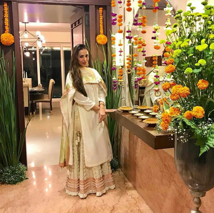 Malaika hosted a Diwali party at her home last evening. She invited a lot of friends including model and actress Aditi Govitrikar . Malaika's house was decked up with beautiful diyas, lighting and marigold flowers. It was looking heavely beautiful. The hostess wore a stunning White and Gold Sharara by designers Sukriti & Akriti which she complemented with statement earrings and bangles from Satyani Fine Jewels. She chose a jutties to complete her outfit by Brand Juttichoo. We just loved how ravishing she looked.