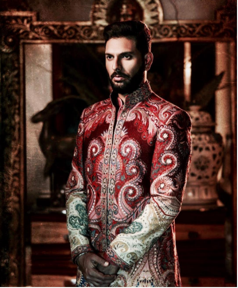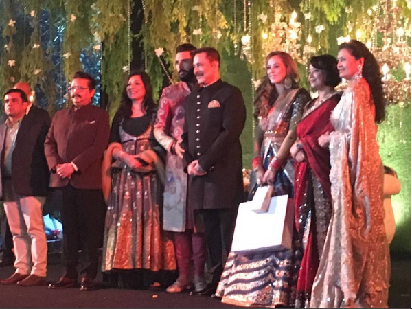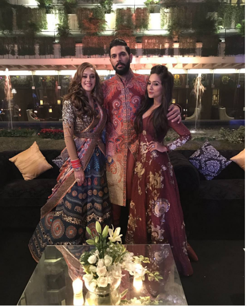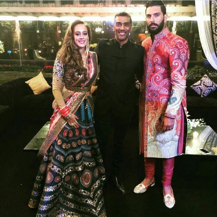 Yuvraj Singh and Hazel Keech's wedding was one of the most awaited weddings of the year. Now the much in love couple is finally hitched for life and we couldn't be happier. We still can't get over their Goa pics and now we present to you guys their reception pictures. Yuvraj and Hazel Keech threw a lavish wedding reception in New Delhi yesterday evening and the couple looked stunning and oh so gorgeous! The couple wore JJ VALAYA Couture wedding clothes for which they had already shot earlier at the designer's house itself! Hazel wore a breathtaking Blue and peach lehenga and Yuvi looked hot in hues of blue and reds.