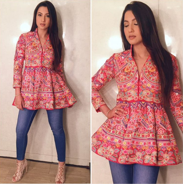 Gauhar Khan entered the Bigg Boss house to meet Bani J and she opted for beautiful jacket from designer Sonali Gupta which is she paired with skinny jeans and beige heels. Her gorgeous look was styled by celebrity stylist Devki B. We just loved how she looked in her ensemble.