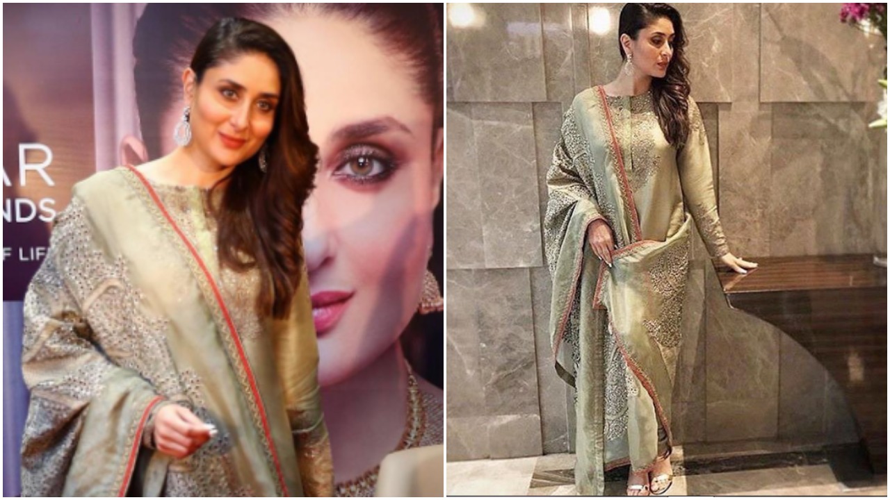 After vacation Kareena Kapoor is back on work with a swag. She never fails us to impress with her style. Yesterday, she was spotted at a jewellery store launch event in Delhi. She looked breathtaking in olive green suit by designer Anamika Khanna. She wore kurta and churidaars were paired with an embroidered dupatta.