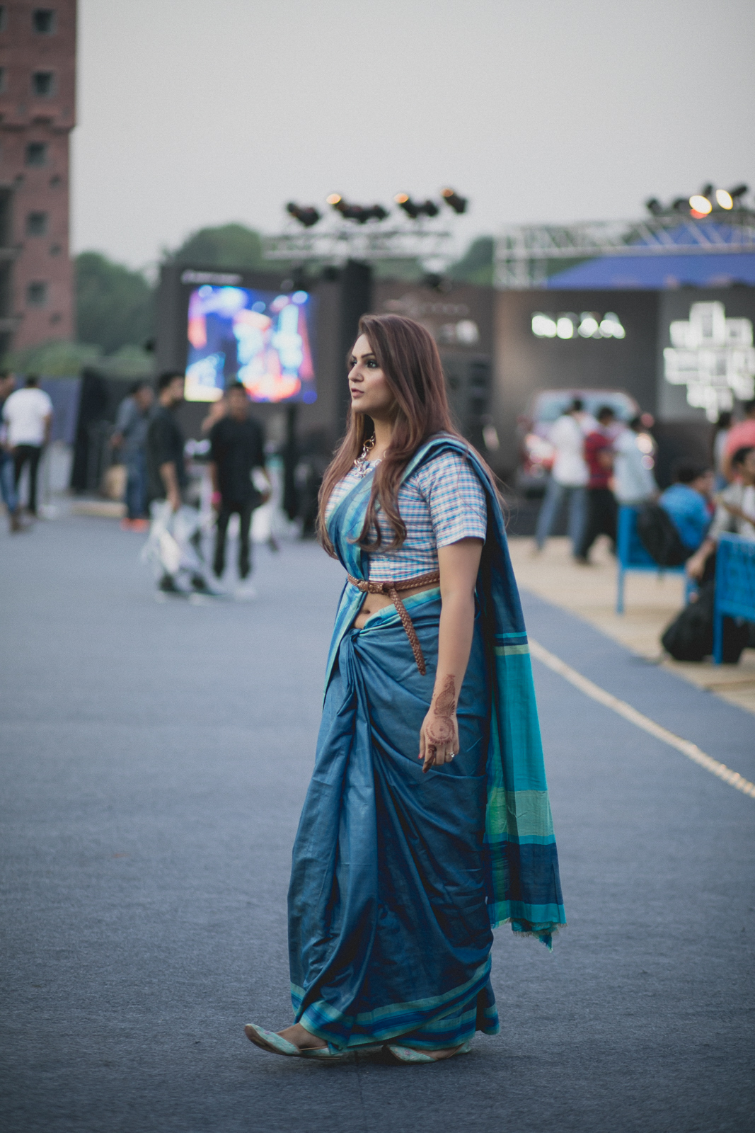 I choose to do a look that represents my personality and who I really am. A traditional woman with a “girl boss” attitude and that’s why I proudly wore a saree by designer Ptiti Sahni in all its glory. This stunning silk saree in hues of blue complimented my vibe impeccably. For a laid-back fashion week look, I loved to pair this saree’s original blouse that features a contrasting printed pattern. The minimal jewellery might look casual but the statement clutch purse from designer Puneet Gupta amps up the overall style quotient. This clutch purse blends in beautifully on the outfit and at the same time embraces the multi-faceted qualities of a modern Indian woman! And in case you didn’t notice already, I wore a pair of printed Juttis with my saree because comfort comes FTW. You can now shop this look online on Amazon.in