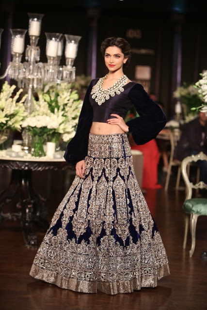 With superstar Shah Rukh Khan and Deepika Padukone on the ramp, stunning old world setting and 1930's inspired wedding collection, Bollywood's favourite designer Manish Malhotra brought the curtain down at the PCJ Delhi Couture. While model-turned-actress, Deepika looked stunning in a navy blue velvet zardozi lehenga teamed with full puffed sleeved choli, her Chennai Express co-star SRK kept it simple in a black suit.